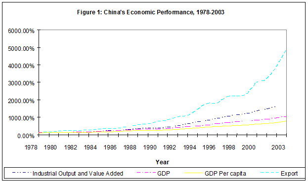 11 All original value of GDP, GDP per capita, industrial output value, and exports in 1978 are treated as 1 or 100 percent. The growth rates of GDP per capita and export for 2003 are estimated. Therefore, the value of exports in 2003, for example, is about 50 times of the value in 1978. Caution: the line of the industrial output and value added between 1978 and 1991 reflects the change rate of gross industrial output value, while part of this line between 1993 and 2002 reflects the change rate of industrial value added. Therefore, this line is inconsistent.