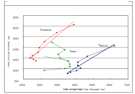 Because the Yangtze region is major economic force in China, figure 2 shows the comparison to the freight movements between Chongqing, Wuhan and Nanjing in the upper, middle and lower Yangtze River respectively to the Chinese GDP. Chongqing is a major force in this region. These comparisons would show the relations of ports to the urban economies are different. The results of calculation and comparison to the data from 1997 to 2005 showed that the relation of freight movements of Nanjing to its GDP was linear, and that the freight movements of Wuhan exhibited more regressive freight movements. However, the driving power of water carriage freight amount to GDP in Chongqing was stronger than for Nanjing with each ten million ton of water carriage freight have driven GDP to increase about 70 billion Yuan RMB in Chongqing, but it was 50 billion in Nanjing. This shows that the economical developments of Chongqing depend much more on port, and an important aspect of Chongqing internationalization is fully to exert the fresh river shipping potential of Yangtze River and develop imported processing industries.