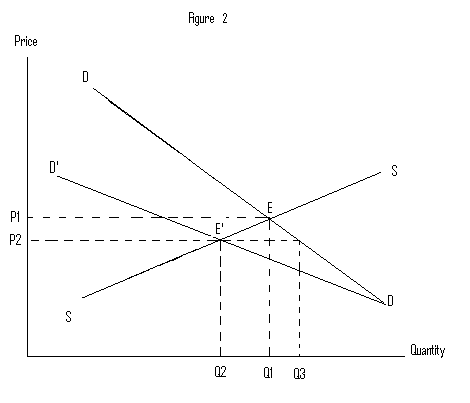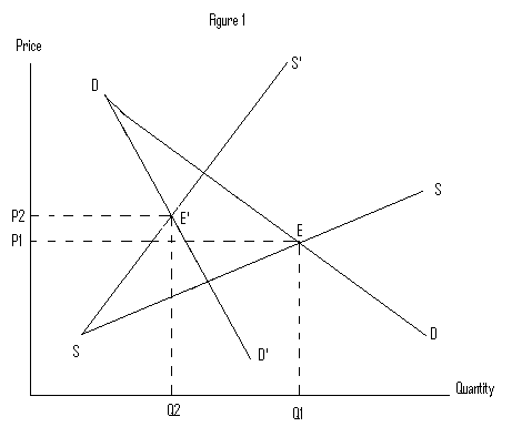 The new market equilibrium is the intersection point of new demand and new supply curves. Compared to the short-run equilibrium point E, E’ represents a higher price level and a lower quantity sold.