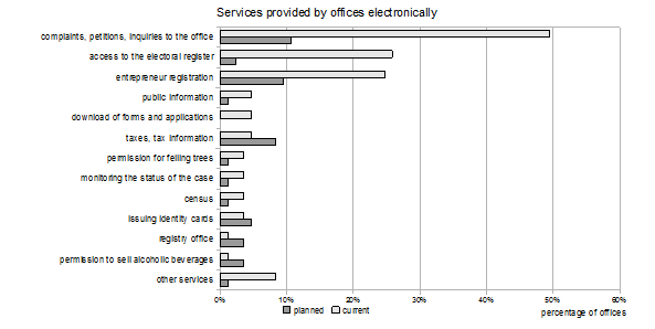 Only 67% of the offices provide services electronically. The number of services varies from one to a dozen. In half of the offices complaints are accepted, requests and inquiries to the office headed by the national system for electronic communication with public administration (e-PUAP)[11] or their own solutions (electronic inbox). A large number of respondent are allowed to deal with matters relating to the register of voters and business records. Other services are carried out electronically in the individual offices, these include: providing public information, providing active forms and applications, provision of tax information, licensing for felling trees or the sale of alcohol, the case of civil registration, identity cards and census, and also monitoring the status of the case (Fig. 1).