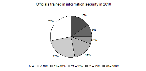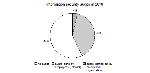 In 57% of office audits of information security have not been conducted in 2010 (Fig. 3). In 39% of the office audits have been conducted internally. Only 4% of offices have decided on external audits. Research carried out by workers are cheaper and can be conducted more frequently, which is their advantage. A disadvantage is the possibility of lenient treatment of certain practices in the office (unwarranted show of understanding for security breaches to facilitate the work), and fall into a rut, as well as ignoring new threats (no development). The optimal solution is therefore a complement of internal audits with external audits.