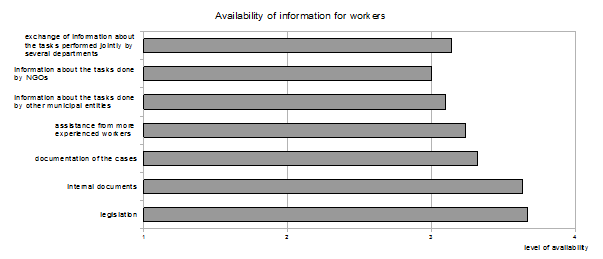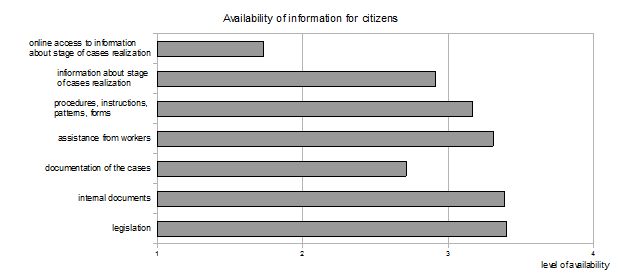 A little worse, officials assessed the availability of information to citizens. It was recognized that access to legislation and workers assistance were least sufficient. In contrast, the availability of the documentation of cases and information about the stage of cases realization is perceived much worse. Online access to information about stage of cases realization was assessed as the worst. These are the areas where improvement is highly desired.