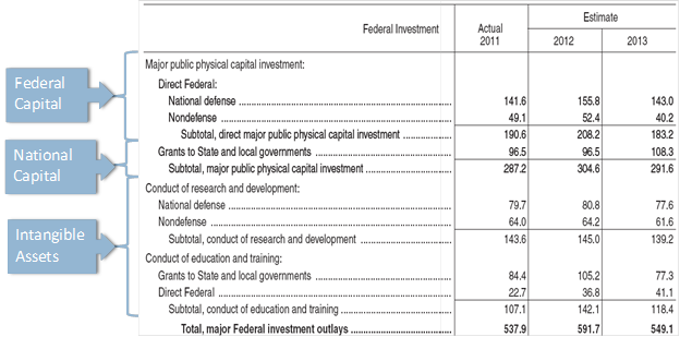 The primary technical concern associated with a capital budget is the difficulty in gaining consensus on how capital should be defined. Provided implementing a federal capital budget would make it easier to obtain funding for capital projects, "program advocates would have strong incentives to get their proposals classified as capital spending" (CBO, 2008, p. 9-10), which could lead to conflict over how narrowly or broadly capital should be defined. As discussed above, the definition of capital is subject to interpretation. The table below describes all federal spending for FY 2011 which OMB defines as federal investment, which includes all "federal outlays that produce long-term benefits to the national economy" (Istrate & Puentes, 2009, p. 2). Theoretically, all such spending might be classified as "capital spending," which would amount to capital spending of approximately $538 billion.