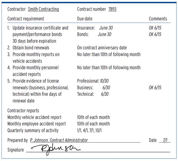 Contract administrator's checklist The contract administrator's checklist (Exhibit 1 at the end of the chapter) lists the licenses, certificates, bonds, and insurance and the reports, forms, and other deliverables required of the contractor during the contract term. The checklist is prepared by the contract administrator at the beginning of the contract term and is reviewed at specific intervals-anywhere from monthly to annually-to ensure that all items are current. Although the contractor's failure to provide the required items on time is a factor in the evaluation of performance, the checklist is more an aid for the contract administrator than an evaluation form in the strict sense.