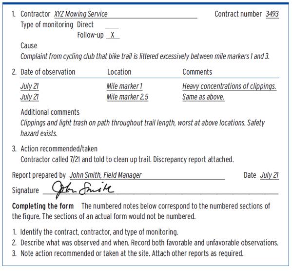 Information on output is generally gathered by the contract administration team. Information on outcome, or results, may be derived from multiple sources, including data collected from users of the service. [1]Both output and outcome monitoring are based on information that must be gathered and recorded, and this chapter covers a number of approaches to obtaining data and documenting performance, including observation records, discrepancy reports, field diaries, surveys, and customer hotlines.