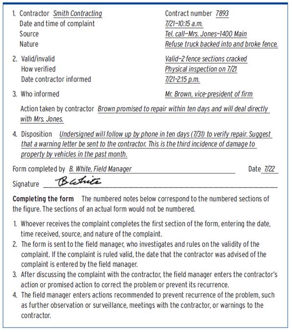 Resolution of service complaints Review the procedures for prompt resolution of complaints generated by citizens or local government clients. Review any complaint forms devised for the contract and the information required from the contractor to complete them. If the contractor is responsible for managing the complaint process independently, describe the nature and frequency of any reports required.