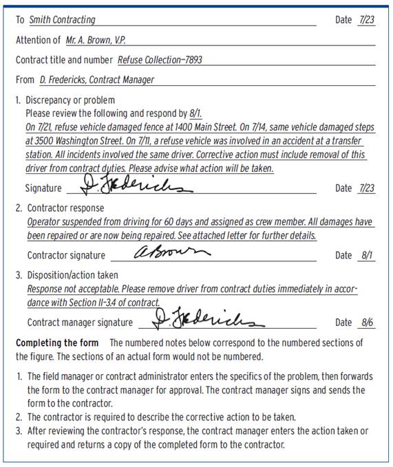 On the discrepancy form, the contract manager requires the contractor to respond within a specified time. After reviewing the contractor's response, the contract manager decides whether further action should be taken to prevent recurrence of the problem. A copy of the completed form is then returned to the contractor with a cover letter expanding on the entries, if necessary.