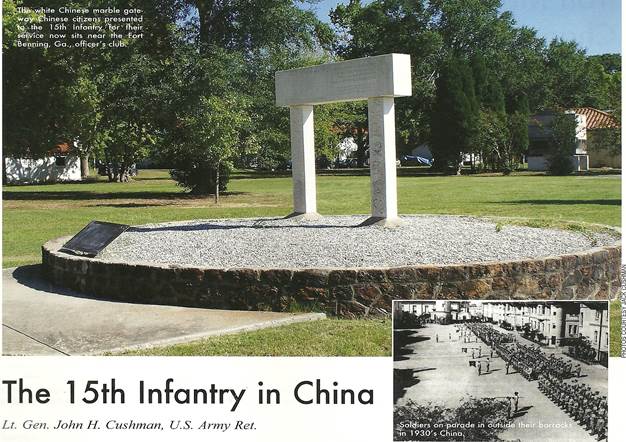 This competition often made it necessary for the units of the 15th Infantry to patrol, deploy white Chinese marble. Chinese citizens from Tientsin's surrounding towns and villages had presented it to the regiment in April 1925, after a truce had ended the civil war. When the regiment reported to Fort Lewis, its commander, Col. Joseph A. McAndrew, presented the gateway to the Infantry School and had it shipped.