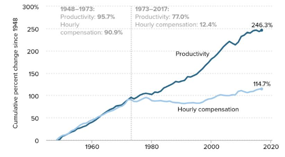 While existing literature regarding automation and the future of work is often biased in various ways, statistical evidence regarding the relationship between technology and the workforce does exist. Take, for instance, the following statistics from the Economic Policy Institute demonstrating how productivity has continued to rise since the 20th century due to technological advancement and how hourly compensation has stagnated: