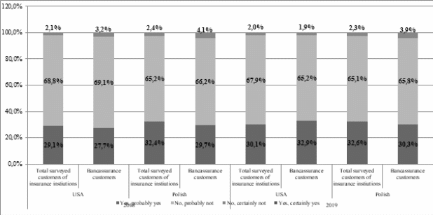 In Figure 2 and 3, we can see that in the opinion of customers, bancassurance services have some attractive features which make them a potentially very profitable segment of the life insurance market. For example, both in USA and in Polish, customers are more willing to pay an extra premium for personalized advisory service or assistance in buying agreements via bancassurance than customers who have no such service. Whereas customers who already have life insurance through their banks, are more willing to purchase such service than those who acquire it through another distribution channel.