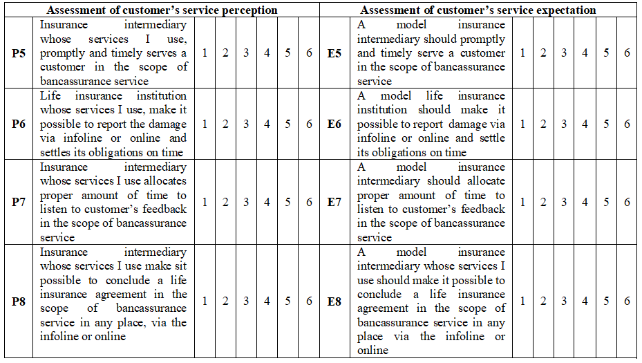 Table 2. Examples of questions about perceived and expected bancassurance service quality in the area of “insurance service speed”.
