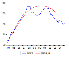 Since all coefficients don't equal to zero significantly, all economic fundamentals have significant effect on RMB equilibrium exchange rate. And it also can be seen from the equation that all coefficients conform to the economic theory. Firstly, what impresses us most is that Consumption-Real Exchange Anomaly also holds in China. The coefficient of resident consumption is 5.2, which indicates that a 1% decrease in resident consumption causes a 5.2% depreciation in RMB real exchange rate. The continuously decreasing of resident consumption restrains domestic demand, which pulls down the domestic price and eventually forces the currency to depreciate. Secondly, the elasticity coefficient of Balassa-Samuelson effect is 0.89, which means that a 1% rise in the grow rate of real GDP will bring real exchange rate to appreciate 0.89%. Furthermore, the coefficient of terms of trade is -0.51, which indicates that, for each 1% betterment in terms of trade, RMB real exchange rate will depreciate 0.51%. It should be mentioned that the Balassa-Samuelson effect is larger than terms of trade effect. So, if resident consumption is constant, the increase of productivity will make the currency to appreciate in the long run, but the elasticity coefficient of resident consumption is so big that the decreasing of resident consumption eventually will make the home currency to depreciate, so Consumption-Real Exchange Anomaly holds in China.