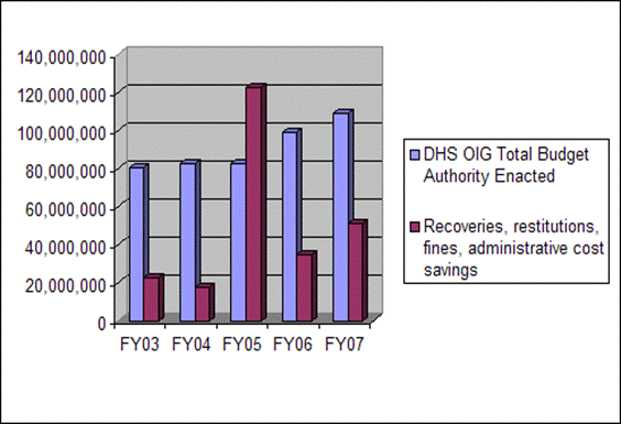 Overall, the outcomes from the Office of the Inspector General of the Department of Homeland Security (DHS OIG) have been moderately increasing during FY 2003 to FY 2007. The amount of recoveries averages a yearly recovery of approximately 60% of the budget for that period.