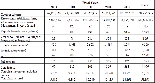 This table summarizes key activities and accomplishments of DHS OIG. During Fiscal Years 2003-2007, DHS OIG identified significant potential dollar savings from a range of audits, investigations, evaluations, and inspections. Cumulatively, these efforts resulted in: $298,483,939 in questioned costs, $247,806,198 from investigative recoveries and receivables, 1,593 indictments; over 1,056 convictions; and about 51,390 complaints processed.
