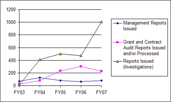The figure shows an increasing number of investigations reports during FY2003-FY2007. The number of reports for investigations in this period is significantly higher than the number of management reports, grant and contract audit reports. The highest increase occurred in FY2007 when there were 1,006 investigation reports, which represents an increase of 214% in relation to FY2006. The number of grant and contract audit reports are second in terms of increasing number of reports. They have been modestly growing, reaching their highest number in FY2006 when there were 304 grant and contract audit reports, which represents an increase of 132% in comparison to FY2005. Management reports show a slight variance during FY2003 - FY2007. Their highest variance and increase occurred in FY2004 when there were 125 management reports which represents and increase of 187% in relation to FY2003.