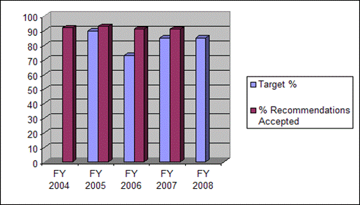 Recommendations suggested by DHS OIG have been positively received by DHS managers. They have concurred with higher percentages of OIG’s recommendations. The percentage of recommendations accepted average approximately 93% per fiscal year. This is indeed an excellent accomplishment of DHS OIG.