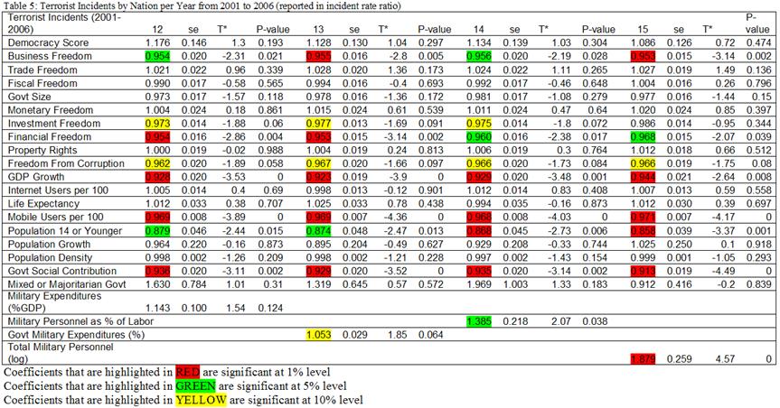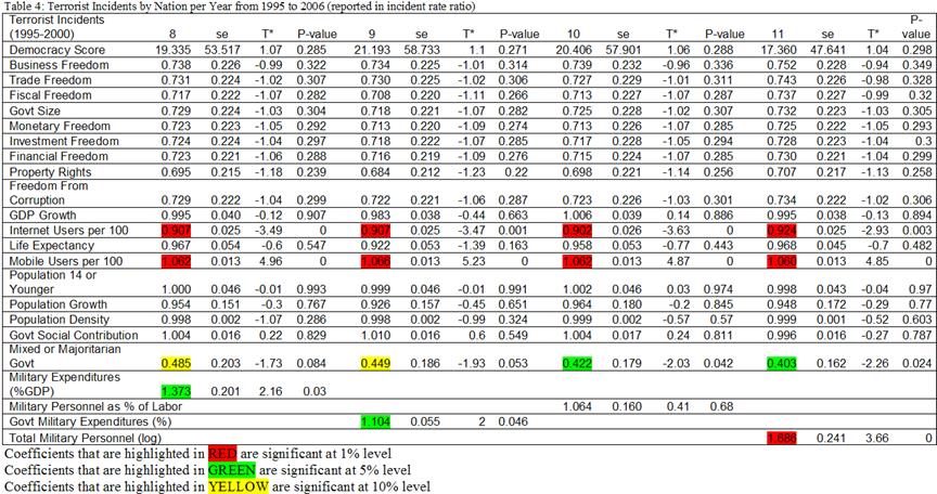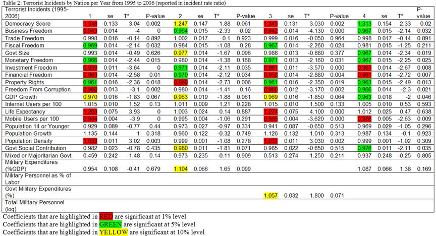 As mentioned, the dependent variable was terrorist incidents. The independent variables included freedom of press, democratic participation (dummy), government power constraint, proportional government, regime durability [“number of years since most recent regime change”[37]], past incidents (average number of incidents since 1968), and post-cold war (if nation arose after the cold war). Also included were controls for regions, government size, and conflict (if nation was involved in a conflict).